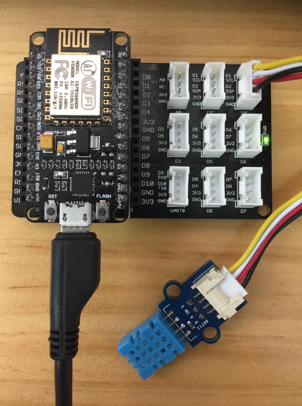 The following steps are best explained with a picture than words. The key thing to note is that the ribbon cable plugs into the D1 PIN. This is crucial because the DHT11 passes data over IIC/I^2C bus and pin D1 is designed to receive data from this sort of bus. While the connector will fit into any of the 9 available plugs the others will not work as expected. This IIC/I^2C pin will change for other devices however it is simply a case of looking at the spec sheet of what ever chip your using and finding the right pin to use. If you use this tutorial as a sample code for your own solutions, be sure to change the pin out in your code reflect their actual sensors or pin requirements.